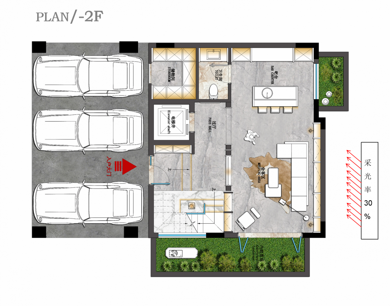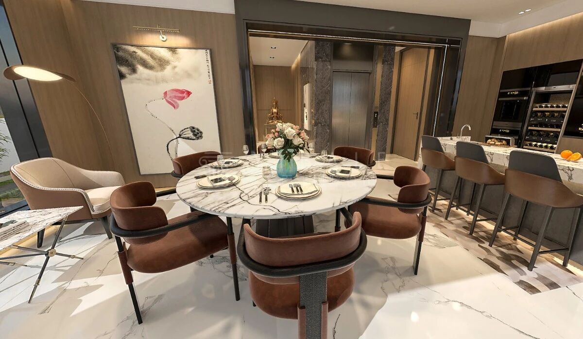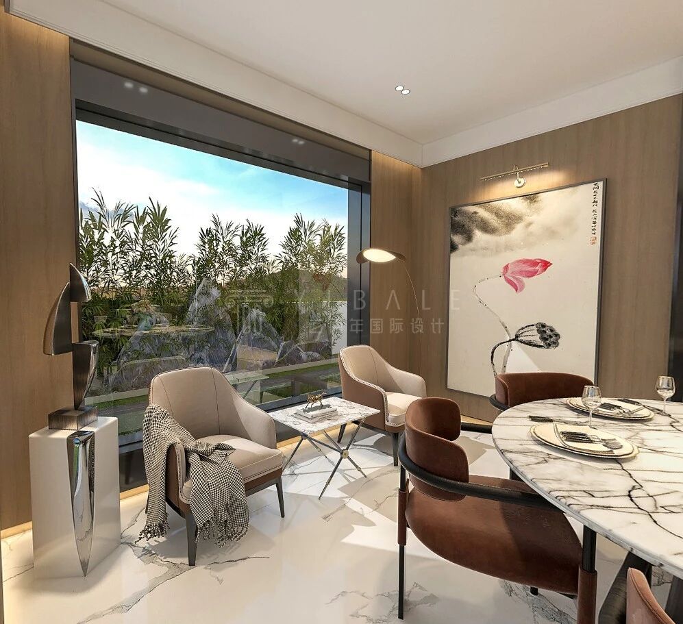 利用庭院的花木之景,打造一个花园式茶室,融情于景,体会与花草对话,与自然和谐相处之道。为保证就餐的轻松氛围,一楼分开设置中西厨,无论是西点牛排还是精致中餐,都能轻松享受。负二楼设置吧台及会客区,工作之余也能轻松享受小酌时光。负一楼设置保姆房及杂物间,便于收纳以及照顾老人。