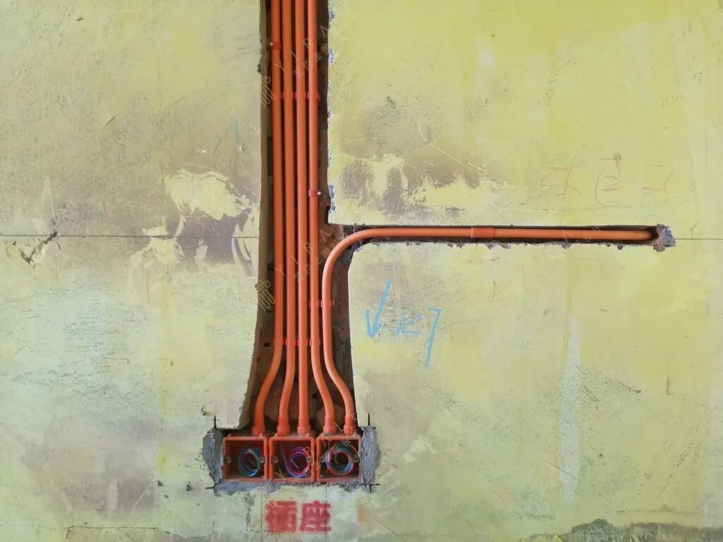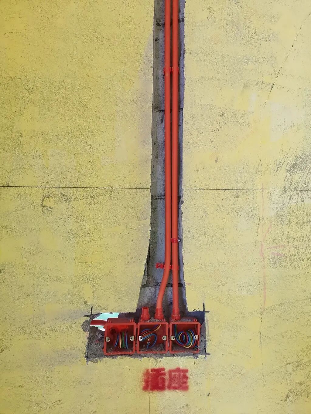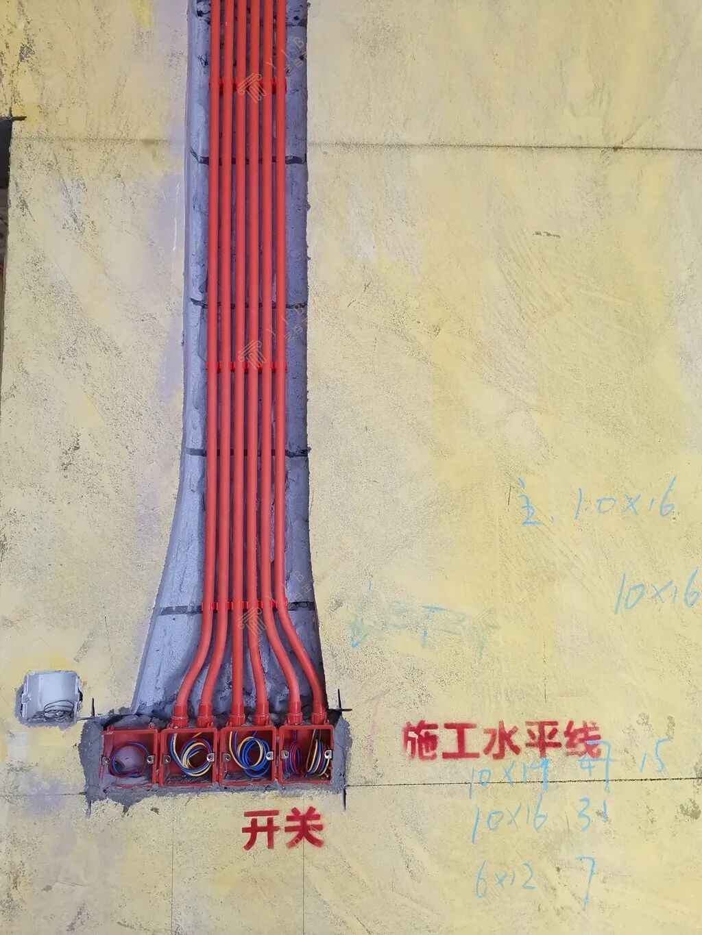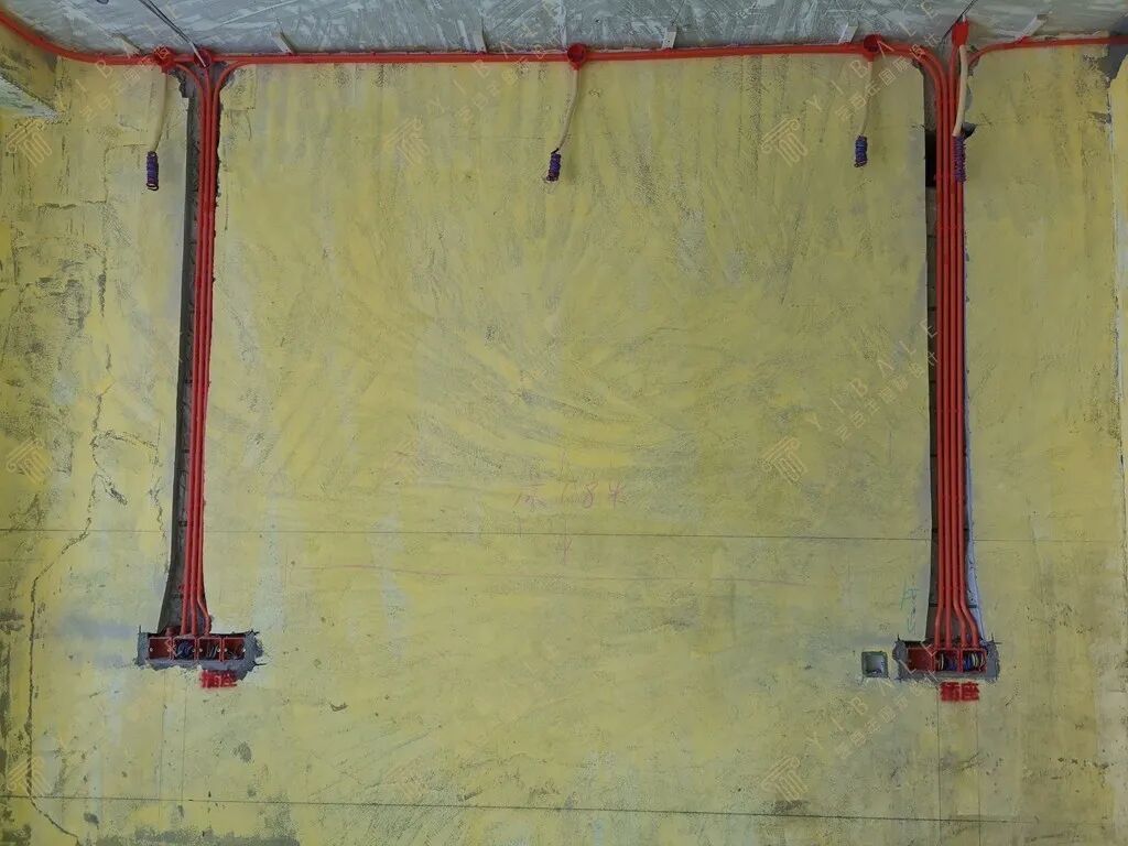 墙面强电线管排布,强电施工主要针对插座以及灯线开关的规划,采用红色线管进行布设。不仅美观要做好,工艺也要追求完美。